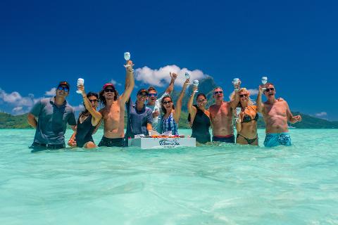 Our unique catamaran will offer you the smoothest ride while sailing in paradise. You will capture the most amazing views of Otemanu mountain, learn about the island history and nature, and celebrate in Paradise Bay with our floating bar. Drinks and snacks will be served on the shallow water as the music palys on the stereo.